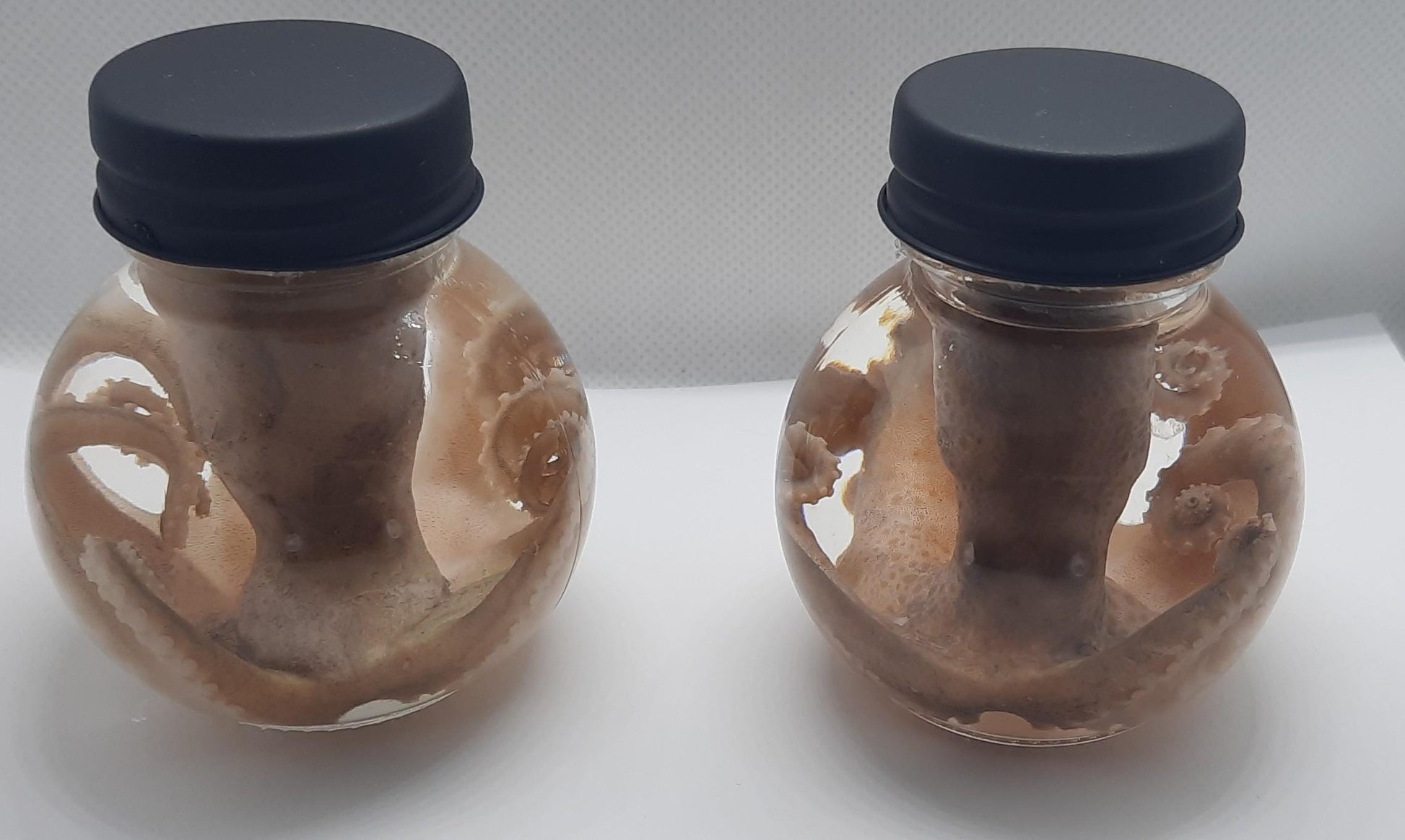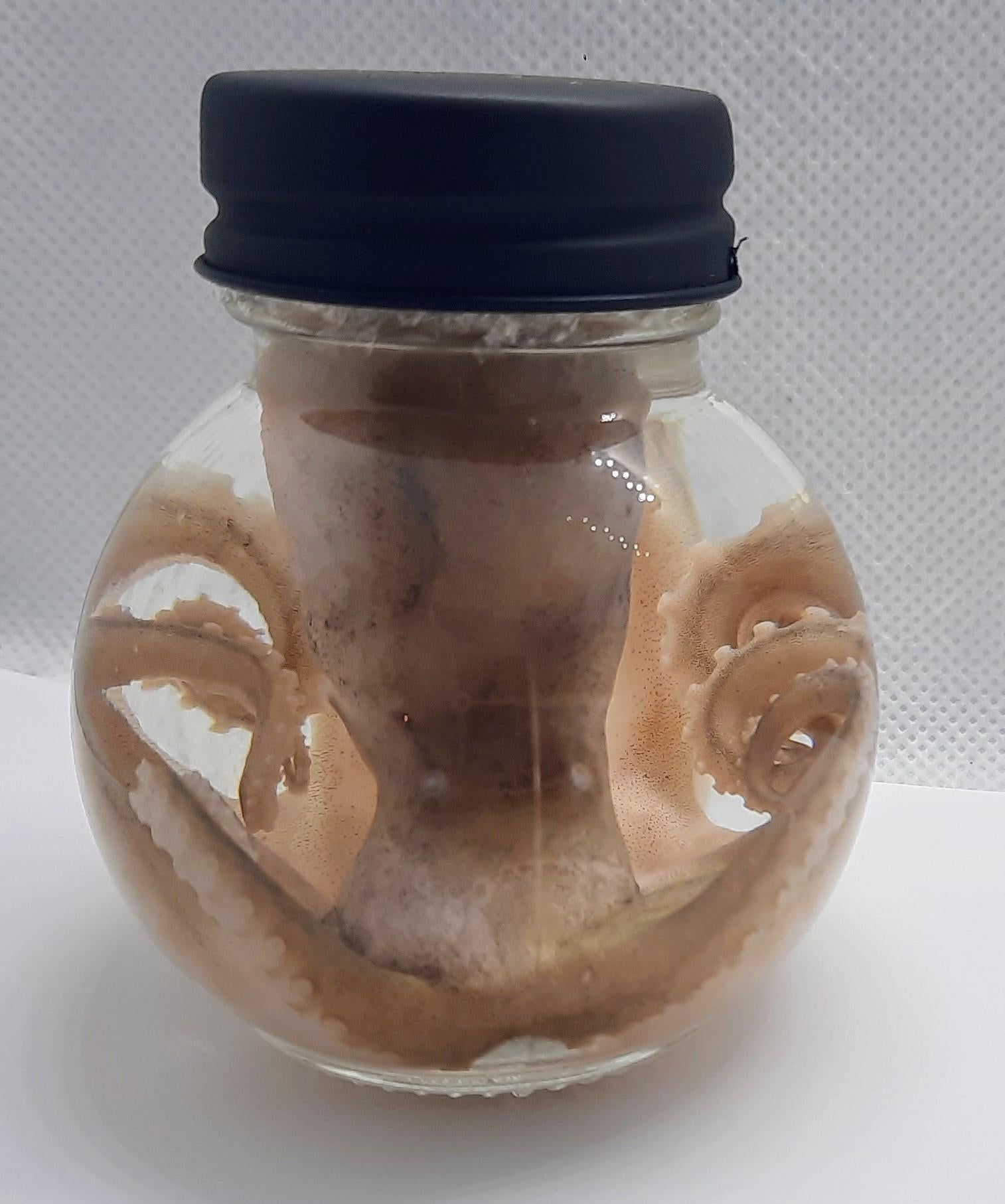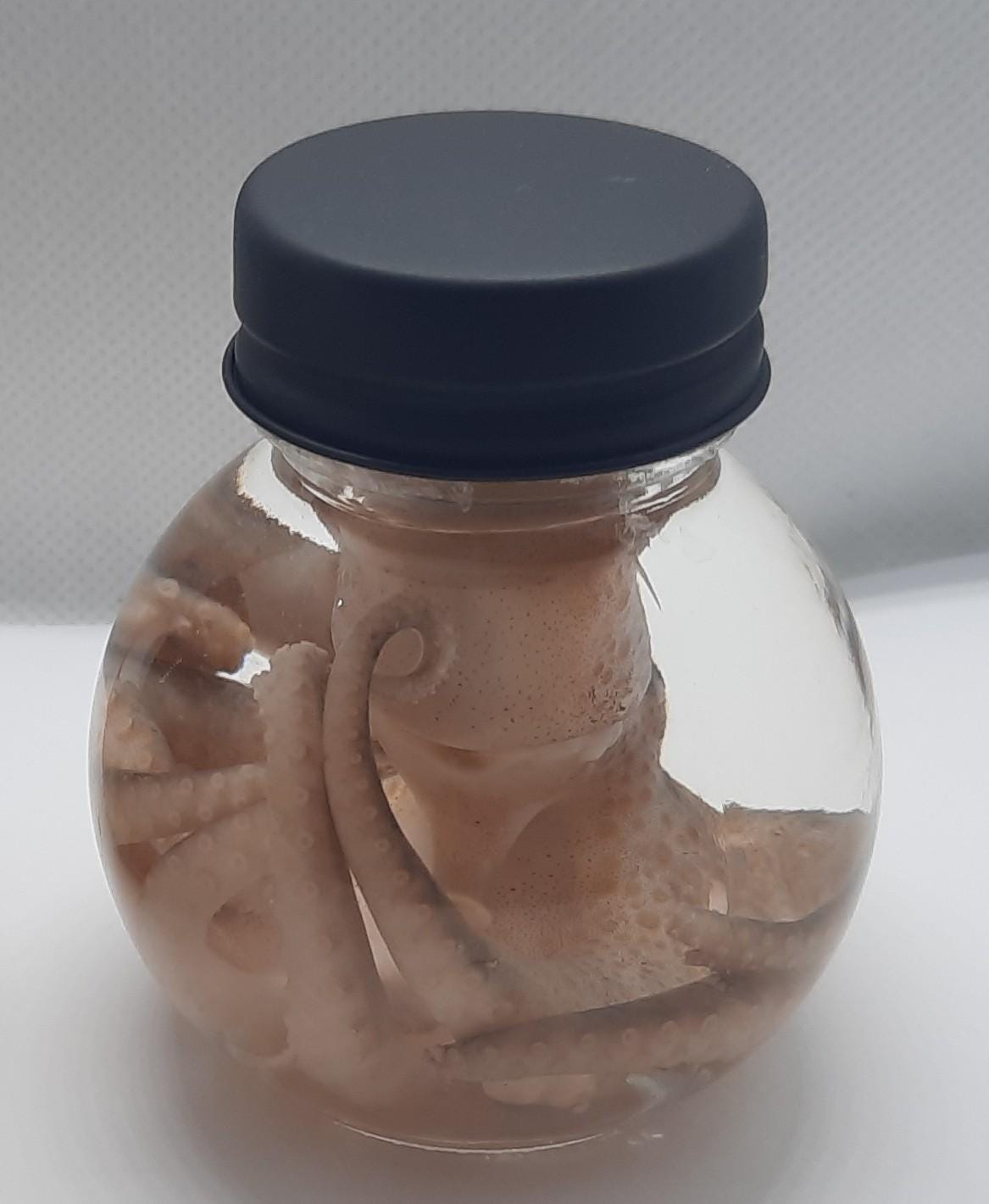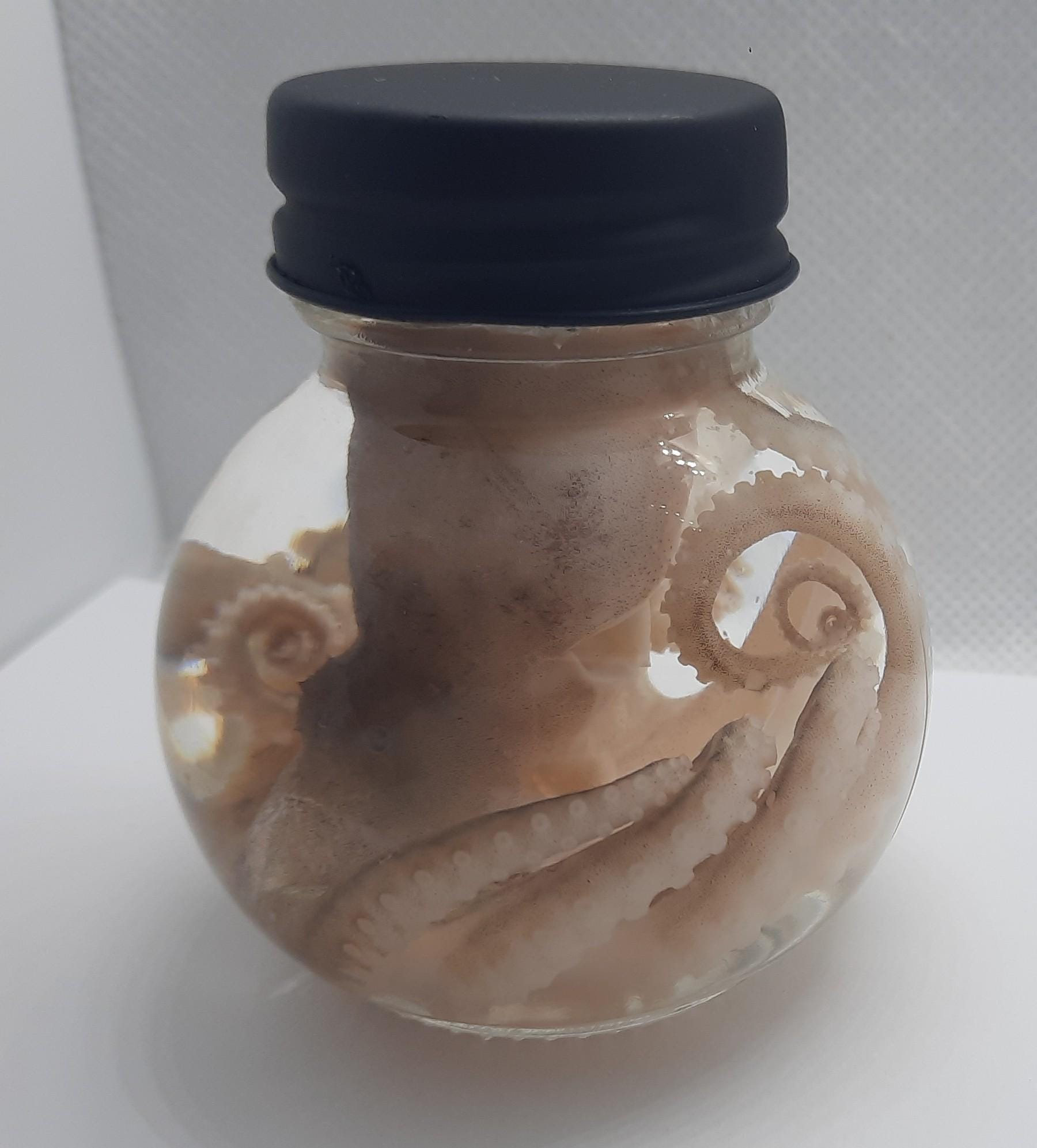 You will receive a QUALITY Wet Specimen Octopus in a unique perfectly fitting glass ball jar. The Octopus fits perfect in this Unique jar and the magnification is awesome as well. !t is professionally preserved and now set in a non toxic solution. The specimen will last forever. You will receive a quality octopus specimen. The jar is 3 inches tall and comes complete with the non-toxic preservative solution. Each octopus varies somewhat as all are unique. Satisfaction Guaranteed. The Octopus is supplied to me by a sea food vendor - expired item - that would have otherwise been thrown out to rot. I have preserved the beauty of this awesome creature.